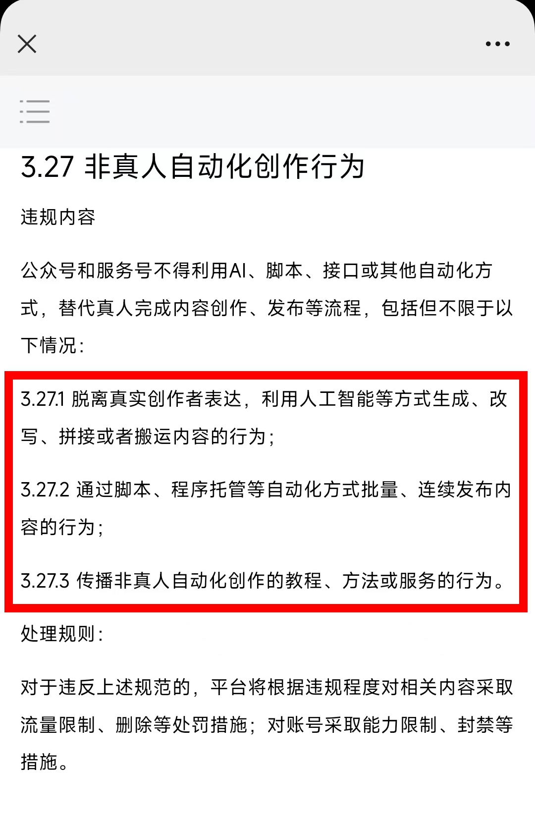 条款 3.27.2 明确指出,禁止“通过脚本、程序托管等自动化方式批量、连续发布内容”。